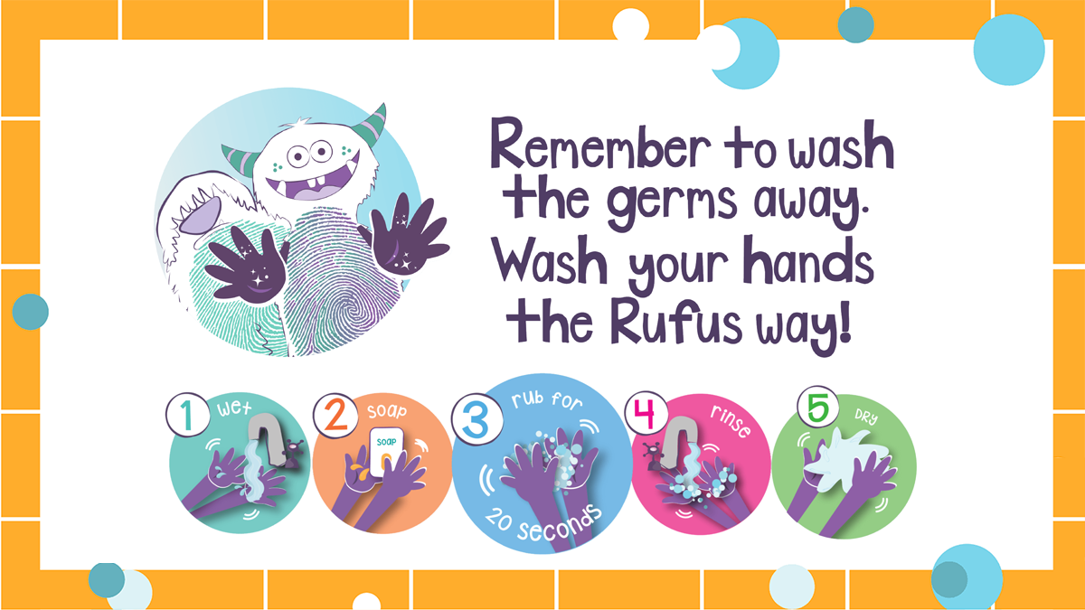 Rufus our handwashing hero teaches kids about good handwashing practice at home – especially how important it is to wash hands for 20 seconds and to dry them properly.